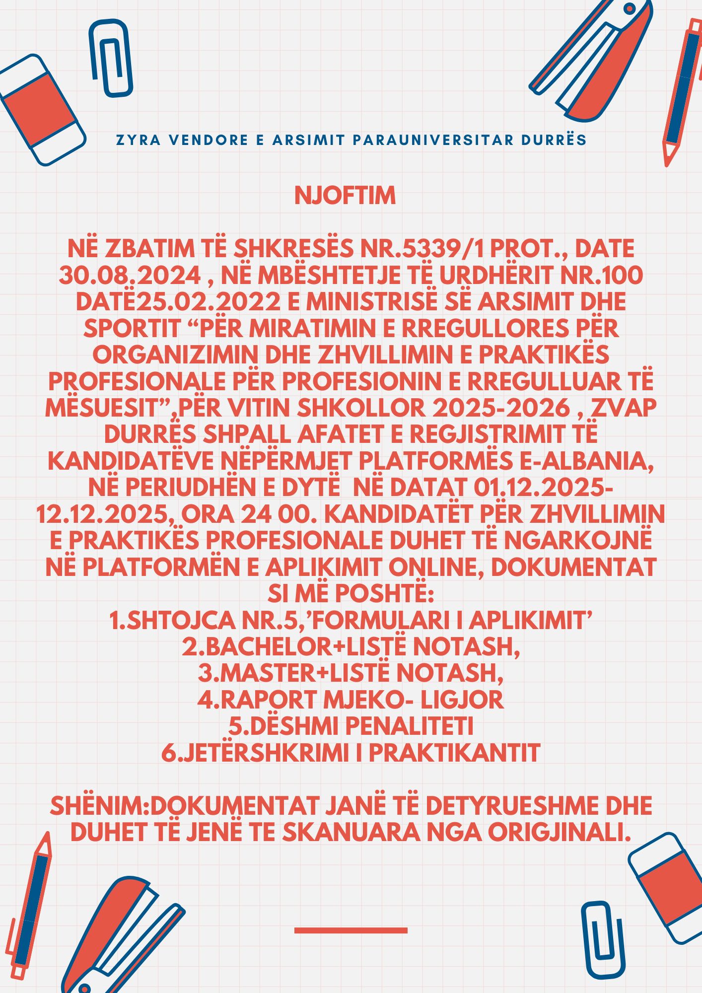 Në zbatim të shkresës nr.5339/1 prot., date 30.08.2024 , në mbështetje të urdhërit nr.100 datë25.02.2022 e Ministrisë së Arsimit dhe Sportit “Për miratimin e rregullores për organizimin dhe zhvillimin e praktikës profesionale për profesionin e rregulluar të mësuesit”,për vitin shkollor 2025-2026 , ZVAP Durrës shpall afatet e regjistrimit të kandidatëve nëpërmjet platformës e-albania, në periudhën e dytë në datat 01.12.2025-12.12.2025, ora 24 00. Kandidatët për zhvillimin e praktikës profesionale duhet të ngarkojnë në platformën e aplikimit online, dokumentat si më poshtë: